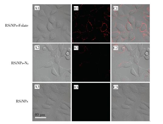考察了HeLa细胞与RSiNPs-Folate、RSiNPs-N3和RSiNPs之间的相互作用及其荧光成像。由图 4可见,当RSiNPs-Folate与HeLa细胞共同孵育1 h后,即可观察到其表面明亮的红色荧光(图 4B1和图 4C1)。然而,RSiNPs-N3与HeLa细胞共同孵育后,仅在极个别细胞表面观察到微弱的荧光,这可能是由于RSiNPs-N3在培养基中分散性较差所导致(图 4B2和图 4C2)。此外,RSiNPs与HeLa细胞共同孵育后,其表面也未观察到明显的荧光(图 4B3和4C3)。上述结果表明,RSiNPs-Folate可特异性地靶向结合叶酸受体呈阳性的HeLa细胞,而RSiNPs-N3和RSiNPs与HeLa细胞之间无明显的非特异性吸附。