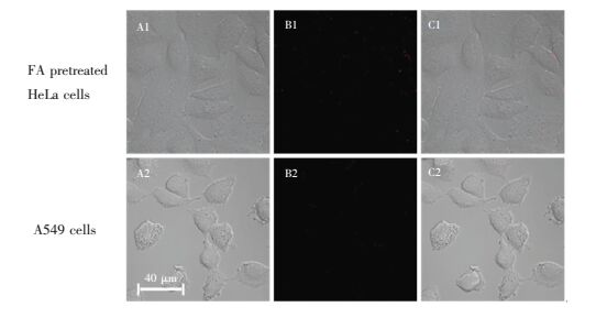 为进一步证实RSiNPs-Folate是通过叶酸受体介导的途径靶向肿瘤细胞的,采用过量的叶酸对HeLa细胞进行预处理,然后加入相同浓度的RSiNPs-Folate进行孵育及荧光成像。由图 5可见,这种经过叶酸预处理的HeLa细胞表面也未观察到明显的荧光(图 5B1和5C1)。在相同的实验条件下,叶酸受体呈阴性的A549细胞也几乎没有荧光信号(图 5B2和5C2)。