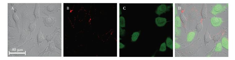图 6 RSiNPs-Folate用于混合细胞(HeLa和A549)的荧光成像。(A)明场成像,(B)荧光成像(RSiNPs-Folate通道),(C)荧光成像(AO通道), (D) A,B与C的叠加图。