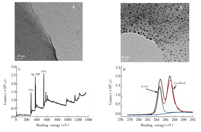 图 1. GO (A)、rGO/AgNPs (B)的透射电镜图; rGO/AgNPs的XPS图谱(C)和C1s全谱(D)Figure 1. Transmission electron microscope (TEM) image of (A) graphene oxide (GO) and (B) rGO/silver nanoparticles (AgNPs), X-ray photoelectron spectroscopy(XPS) spectra (C) and C1s XPS spectra (D) of rGO/AgNPs3.2 rGO/AgNPs的电催化活性增强效应