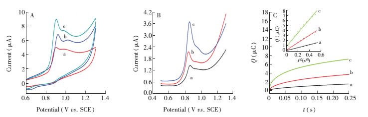 图 2. 裸GCE(a)、GO/GCE(b)和rGO/AgNPs/GCE(c)电极的循环伏安图(CV)(A); 方波伏安图(SWV)(B)和计时库伦曲线(C)Figure 2. (A) Cyclic voltammograms (CV) of 50 μmol/L Bisphenol A (BPA) on different electrodes; (B) square wave voltammograms (SWV) of 8 μmol/L BPA on different electrodes; (C) plot of Q-t curves of different electrodes; Inset: plot of Q-t1/2 curves of different electrodes; bare glassy carbon electrode (GCE)(a), GO/GCE(b) and rGO/AgNPs/GCE(c)采用0.1 mmol/L K3[Fe(CN)6]作为探针分子,用计时库仑法研究了不同修饰电极的有效电极面积(图 2C)。其中,Init E(V) = 0.5,Final E(V) =0.25,Pulse width (s)=0.25,Step=1,Sample (s)=2.5×10-4。根据Anson方程[25]: