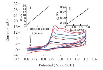 在pH 1.98的B-R缓冲溶液中,不同扫描速率下50 μmol/L双酚A在rGO/AgNPs/GCE的CV曲线见图 3。在双酚A的CV曲线上可观察到两个氧化峰,可能是由于双酚A在酸性溶液中有着两种不同的存在形式[26, 27],即电中性的双酚A分子和其酚盐形式的存在。随着扫描速率(v)从25 mV/s逐渐增加到400 mV/s,BPA的峰电流值(Ip)呈线性增加(图 3插图Ⅰ),且符合方程Ip=3.349+0.028v(r2=0.995),表明BPA在rGO/AgNPs/GCE上的氧化是吸附控制的过程。扫描速率对Ep的影响见图 3插图Ⅱ,Ep与v符合下列方程: