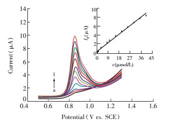 在优化的实验条件下,测定了不同浓度的BPA标准溶液的方波伏安响应信号,氧化峰电流与BPA浓度在0.1~40.0 μmol/L范围内呈良好的线性关系: I(μA)=(0.211±0.005)+(0.368±0.087)C(μmol/L)(图 4),r2=0.996,检出限为50.7 nmol/L(S/N=3)。与文献报道的检测BPA的电化学传感器相比,本传感器具有较宽的线性范围和较低的检出限,如表 1所示。