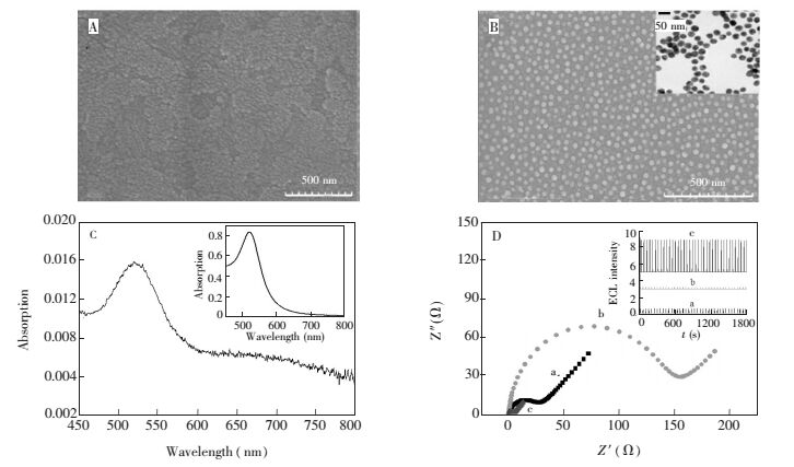 图 1 (A) ITO玻璃和(B)表面沉积AuNPs的ITO的扫描电镜图,插图为AuNPs的透射电镜图;(C)AuNPs/ITO电极的吸收光谱(插图为AuNPs溶胶的吸收光谱);(D)(a) ITO玻璃,(b) APTMS/ITO,(c) AuNPs/ITO的电化学交流阻抗谱图(支持电解质为含5 mmol/L[Fe(CN)6]3-/4-的0.1 mol/L NaCl溶液,插图为对应电极上鲁米诺的ECL信号)
