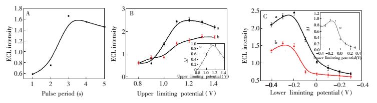 鲁米诺的ECL行为受电极上施加电位及脉冲周期等因素影响,脉冲周期为3 s时发光强度最大(图 2A); 图 2B和2C表明,对于背景发光以及二肽的猝灭程度,最佳的上限电位为1.2 V、下限电位为-0.2 V。