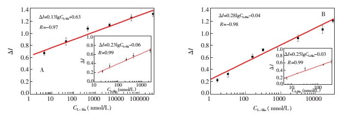 图 3A所示为修饰电极对L-Ala的响应ECL信号,线性范围为4.49 × 10-9~4.49 × 10-5mol/L。相比较而言,在裸ITO上,L-Ala的线性响应范围仅为2.24 × 10-5~2.24 × 10-3mol/L,表明AuNPs功能化极大提高了电极的响应性能。图 3B为AuNPs/ITO电极测定不同浓度L-His的ECL响应信号,线性范围为1.62 × 10-8~3.24 × 10-5mol/L。