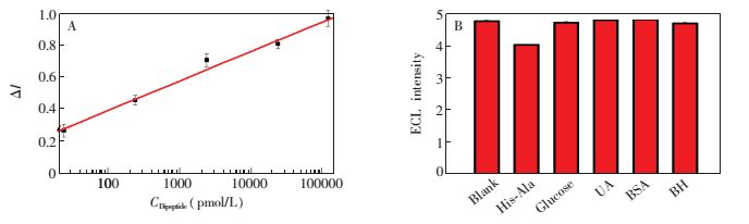 如图 4A所示,本方法测定His-Ala二肽的线性范围为2.44×10-11~1.22×10-7mol/L,线性方程为ΔI = 0.18lgC (pmol/L)+0.03,r)=0.99,检出限为2.42×10-12mol/L(S/N=3)。石明娟等[23]的研究表明,能量转移作用可抑制鲁米诺的ECL,其作用机制属动态猝灭[24]。本研究结果表明His-Ala较单个氨基酸分子有更高的猝灭效率。