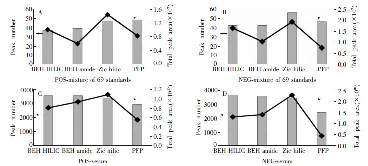 图 1. 标样、血样在不同色谱柱分析下的峰检出数目和总响应比较。A、B代谢物标样; C、D血清样本。A、C正离子模式; B、D负离子模式。PFP:五氟苯基柱Figure 1. Comparison of total peak number and peak area of mixture of 69 standards and serum detected by 4 candidate chromatographic column. A, B for mixture of 69 standards; C, D for serum. A, C for positive mode; B, D for negative mode. PFP: pentafluorophenyl column此外,考察了4根色谱柱用于血样的分析效果,分析结果见图 1C和1D。无论是正离子还是负离子模式下,ZIC-HILIC柱峰匹配得到的特征峰总响应均高于其它柱,特征峰总数目也较多。