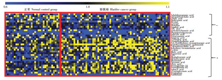 采用本研究建立的亲水作用色谱/质谱联用的非靶向代谢组学分析方法, 分别在正离子、负离子模式下, 对64例膀胱癌患者和32例正常对照组血清进行分析。数据经QC校正及80%规则去零值后进行非参数检验,p < 0.05表示该代谢物在膀胱癌患者和正常人血清中含量有显著性差异。利用保留时间、精确质量数以及二级质谱的断裂方式进行数据库查询,对这些差异变量进行结构鉴定。再将候选化合物的色谱-质谱信息与标准样品的色谱-质谱信息进行比对确认。最终在正、负离子模式下共鉴定出35种差异代谢物(见电子版文后支持信息附表 2),这些差异化合物可视化变化结果显示在热图中(图 3)。从图 3可见,相对于正常人,膀胱癌患者中组氨酸、亮氨酸、水杨酸、鹅去氧胆酸、部分游离脂肪酸等含量下调; 而胱氨酸、色氨酸、苹果酸、甘磷酸胆碱(Glycerophosphorylcholine,GPC)、肌醇、黄苷等含量上调。