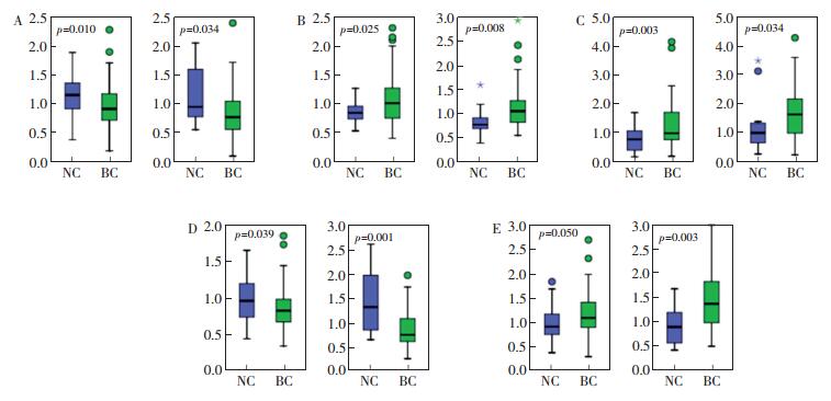 图 5 5种差异代谢物在发现集和验证集中含量的箱图。A:鹅去氧胆酸; B:二十碳烯酸; C:甘磷酸胆碱GPC; D:十二碳烯酸; E:胱氨酸。每组图中左侧为发现集,右侧为验证集。NC表示对照组,BC表示膀胱癌组