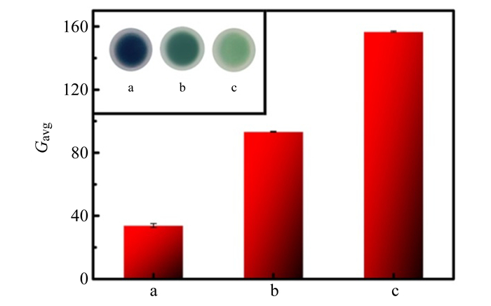 图 2. ES-PANI/TiO2混合液的绿色通道值:(a)未加Cu2+,紫外光照射,(b)加入Cu2+,无紫外光照射,(c)加入Cu2+,紫外光照射。插图:对应溶液颜色照片Figure 2. Gavg values of emeraldine salt of polyaniline (ES-PANI)/TiO2 solution in the absence (a) and presence (b, c) of 0.4 mmol/L Cu2+ after (a, c) and before (b) UV light irradiation. Inset: Corresponded solution photographs in the plate wells3.2 可视化检测机理