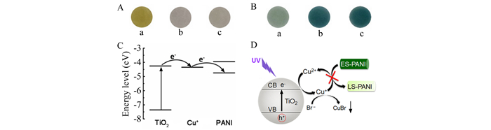 基于上述实验结果和能级关系,可以推断Cu2+检测机理如下(图 3D):Cu2+在紫外光照射下与TiO2相互作用生成Cu+,Cu+将ES-PANI还原为LS-PANI,其本身再次被氧化为Cu2+,使得溶液颜色呈现淡黄色。然而,若加入过量的KBr与Cu+反应生成CuBr沉淀,ES-PANI的还原反应会被阻断。所以,混合溶液颜色对应Cu2+调控下不同价态的PANI。