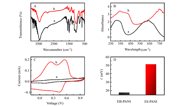 利用红外光谱(图 4A)和紫外吸收光谱(图 4B)表征了ES-PANI。红外光谱图可以看出,掺杂后的ES-PANI(图 4A,曲线b)与EB-PANI(图 4A,曲线a)相比,吸收峰向短波长移动,与文献[38]相一致。ES-PANI在800 cm-1附近的峰由N—H面外弯曲震动产生。1055 cm-1附近的强吸收峰和1233 cm-1的峰分别来源于C—C拉伸和C—C扭曲。1292 cm-1处的峰归因于C—N拉伸。在1455 cm-1处可观察到芳族化合物的C=C拉伸吸收。592和668 cm-1处的峰是C—Cl拉伸峰,上述证明了ES-PANI的成功掺杂[39]。同时,观察到EB-PANI在320和640 nm附近有两个紫外吸收峰(图 4B,曲线a)。质子化后,在350、426和760 nm附近出现3个不同的ES-PANI吸收峰(图 4B,曲线b),与文献报道[40]相一致。