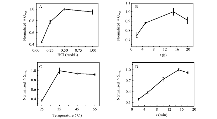 为了获得最佳比色效果,对HCl掺杂浓度、振荡时间、光照反应温度和光照时间进行了条件优化(图 5)。由于颜色变化直接与检测灵敏度相关,所以用溶液在光照前后的颜色变化差值,即ΔGavg值作为评价标准,并对ΔGavg值做归一化处理。如图 5A所示,ΔGavg值不断升高并在HCl浓度为0.5 mol/L时达到平台,因此选择0.5 mol/L HCl为掺杂的最佳浓度。如图 5B所示,当HCl浓度为0.5 mol/L时,ΔGavg值在振荡时间为15 h时达到最大值,然后随振荡时间延长而降低。因此选择最佳振荡时间为15 h。此外,光照反应温度对ΔGavg值的影响如图 5C所示,随着反应温度的升高,ΔGavg值迅速升高,在反应温度35℃时达到平台,继续升温对ΔGavg值影响不大,推测可能与溶液不断蒸发有关。因此,选择35℃为最佳反应温度。在反应温度为35℃时,随着光照时间的增加,ΔGavg值不断升高,并在光照15 min时达到最大(图 5D),因此选择15 min为最佳光照时间。