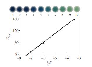 Figure 6 Photographs for the optimized colorimetric detection of Cu2+ with the naked eyes in the plate wells, and linear relationship between Gavg value and logarithm of Cu2+ concentration (from 1 to 10): 0, 0.04, 0.1, 0.4, 1.0, 4.0, 10, 40, 100 and 400 μmol/L
