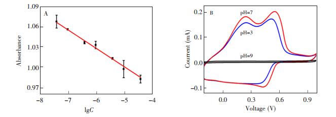为了研究ES-PANI的稳定性,将ES-PANI溶液暴露于空气中2、10、24和72 h,混合液未观察到明显的颜色变化。此外,通过颜色变化与循环伏安曲线,考察了ES-PANI在pH值为3、7和9时的稳定性(图 7B)。可知,ES-PANI在空气中或酸/中性条件下均表现出优异的稳定性。