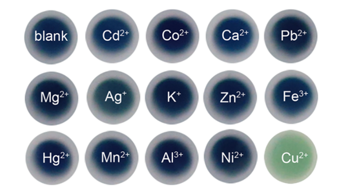 为了评估方法的可靠性和实用性,对人类头发样品进行了分析检测。用本方法检测头发中Cu元素含量为11.6 μg/g,与原子吸收光谱测得结果(10.8 μg/g)相近。加入1.0、3.0和9.0 μmol/L Cu2+标准储备液,回收率分别为94.1% ± 3.5%、105.8% ± 1.9%和102.1% ± 3.0%。上述结果证明了本可视化检测平台的可靠性。