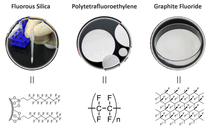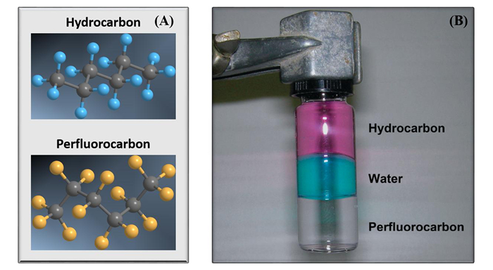 在自然界中,全氟烷烃是一类较为特殊的物质。从分子结构上来说,全氟烷烃是将普通烷烃中所有氢原子用氟原子取代而形成的(图 1A)。由于都是非极性分子,全氟烷烃和普通烷烃一样,都具有较高的疏水性。但和普通烷烃相比,全氟烷烃的疏水性更强,这主要是因为氟原子的原子半径大于氢原子,使得全氟烷烃的分子截面积更大。在与水分子接触时,虽然普通烷烃和全氟烷烃的固有疏水性相似,但由于全氟烷烃有着更大的疏水表面,因此展现出了更强的疏水性[11]。另一方面,由于氟原子极化率低,全氟烷烃分子之间的范德华作用力弱于普通烷烃,导致其与普通烷烃之间的互溶性变差;在室温下,全氟烷烃也几乎不溶于常见的有机溶剂,如甲苯、四氢呋喃、丙酮等,体现出了良好的疏油性(图 1B)[12, 13]。而与疏水性和疏油性相对的是,全氟烷烃与其它全氟化合物(如全氟胺、全氟醚等)之间有着良好的互溶性,同时也是理想的气体溶剂,能够溶解大量的氢气、氧气、氮气、二氧化碳等气体[11, 12]。因此,全氟烷烃及其类似全氟化合物在有机合成和催化领域都有着广泛的应用。与此同时,其在材料领域的应用也十分普及,如日常生活中常见的“不粘涂层”就是聚四氟乙烯高分子。而氟固相萃取技术的基本原理,也正是基于上述全氟烷烃及其类似全氟化合物的特殊性质。