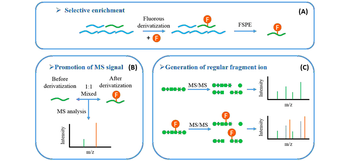 氟固相萃取技术在各个领域,尤其是生物分析领域的广泛应用,极大地推动了新型氟标签试剂和高氟化固相吸附剂的发展(图 2)。氟标签试剂方面,由于在分析科学中,氟标签试剂扮演的角色已不再只是用于纯粹的分子衍生和辅助分离,更需要辅助未知分子的定性与定量分析研究,因此具备高富集效率、高特异性反应官能团的氟标签试剂,或是多功能化的氟标签试剂的合成和应用,是主流发展趋势。而为了兼容各类分析方法,近年来,除了如具有光化学反应活性[25],或是同位素标记的氟标签试剂之外[26],具有光学特性以及良好生物兼容性的氟标签试剂的合成和应用亦有文献报道[27]。在高氟化固相吸附剂方面,除了前面所提到的常规全氟二氧化硅之外,新材料的制备和应用也颇受关注,如对全氟二氧化硅进行改良设计,使其带上新的功能(如磁性全氟二氧化硅[28~30]),便是高氟化固相吸附剂的一大发展方向。本课题组将氟化石墨这一高氟化碳类材料用于氟固相萃取,相比于商业化的氟固相萃取柱,氟化石墨不仅因为工艺较成熟而价格低廉,而且展现出更好的富集选择性、更低的富集检出限和更高的富集回收率,是商业化氟固相萃取柱的良好替代品。由于氟化石墨中很少含有杂原子,其含氟比例接近1:1(摩尔比,氟原子:碳原子);同时,由于材料中的碳原子均为sp3杂化,其表面碳、氟原子构成的整体结构和常用氟标签试剂中的碳、氟原子结构十分相似,这些特点赋予了氟化石墨良好的氟固相萃取性能[31]。除微粒状材料之外,将聚四氟乙烯滤膜用作高氟化固相吸附材料的工作亦有报道[32]。而另一方面,基于氟标签的高疏水性,利用常规C18小柱替代全氟二氧化硅小柱的策略,也为商业化氟固相萃取柱提供了可选的替代材料[33]。近年来,在氟固相萃取参与的各类生物分析应用中,将其用于组学研究的相关技术发展最为迅速,这主要是因为氟固相萃取和生物质谱技术之间良好的兼容性。氟标签的引入不仅有助于目标分析物的分离富集(图 3A),而且由于氟标签自身的疏水性,还能够提高目标分析物的质谱响应信号(图 3B)。另一方面,由于氟标签自身良好的稳定性,使得目标分析物分子在串级质谱碎裂过程中所产生的碎片离子更加容易被预测,不会因为标签部分的碎裂产生大量不规则的碎片离子,而且这些带有氟标签的特征碎片离子可以为目标分子的定性分析提供更多的分子结构信息(图 3C)[34]。又由于氟-氟相互作用带有部分疏水作用的特征,氟固相萃取通常在较低有机相条件下上样和清洗,而在高有机相甚至纯有机相中进行洗脱,因此非常适合于质谱检测前的样品脱盐[24, 31]。正因为这些特征,基于氟固相萃取的生物质谱分析新方法颇受相关领域研究者的关注。本综述的后半部分将对这些新方法及其应用领域做详细介绍。