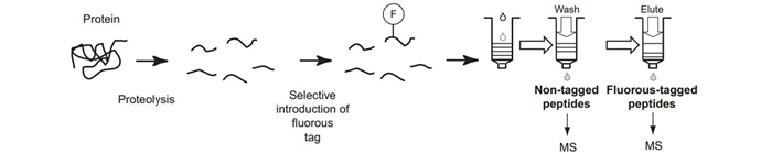 氟固相萃取技术被引入生物分析之初,便被应用于蛋白质组学研究领域,并被视为生物素标签富集技术的良好替代品,在功能蛋白质组研究中具有广阔的应用前景。而氟蛋白质组学(Fluorous proteomics)的概念也是在这一时期被提出并被广泛接受的。相对于传统的生物素标签技术,氟标签不仅同样能够辅助目标分子的分离富集,同时具有更好的质谱兼容性和相对低廉的实验成本。通过带有不同官能团的氟标签试剂,结合高选择性的化学反应和特定的分析流程,利用氟固相萃取技术能够有效地从复杂样品中分离目标肽段或肽段子集,用于质谱检测。因为目标底物可以是带有特定氨基酸(如半胱氨酸、丝氨酸、苏氨酸等)的肽段,也可以是带有特定翻译后修饰基团(如磷酸化、泛素化等)的肽段,良好的普适性使得其在蛋白质组学领域中的应用从一开始就备受关注(图 4)[18]。尽管早期的工作基于基质辅助激光解吸电离质谱(MALDI-MS),只能分析较为简单的生物样品,但随着越来越多基于液质联用技术的工作被报道,氟固相萃取技术在复杂的蛋白质组样品分析方面的研究热度也在不断提升。