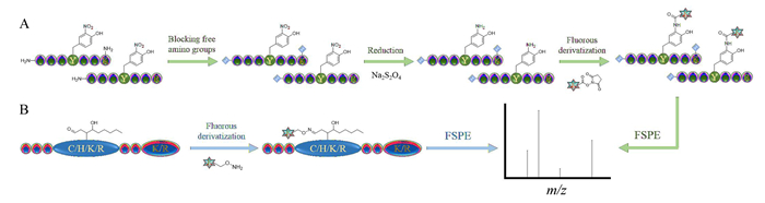 在蛋白质组学研究领域中,翻译后修饰组学研究是一大热点。这是因为蛋白质的翻译后修饰与其功能有着密切的联系。由于蛋白质翻译后修饰大多数情况下是在蛋白质特定的氨基酸侧链上结合特定的化学基团,这些基团通常具独特的化学性质。因此,基于化学反应的蛋白质翻译后修饰研究方法被认为是一类十分有效的研究策略[35]。由于氟固相萃取建立在氟标签试剂与底物之间特异性化学反应的基础上,故而氟蛋白质组学的一个重要发展方向便是其在蛋白质翻译后修饰研究领域中的应用。虽然氟蛋白质组学发展的早期已经有一些针对蛋白翻译后修饰的工作报道[18, 36],但真正将其应用到规模性的蛋白质翻译后修饰组研究中的工作始于2011年[37], 研究者将这一技术应用到了酪氨酸硝基化的研究中(图 5A),该方法的基本流程是先将胰酶酶解肽段的自由氨基封闭,并用连二亚硫酸钠将被修饰酪氨酸侧链上的硝基转变为氨基,然后再利用氟标签试剂特异性地反应新生成的氨基,最后通过氟固相萃取分离富集修饰肽段,用于质谱分析。研究者利用这一策略,成功地在人肝癌HuH-7细胞系裂解液中鉴定到了来自28个蛋白的28条酪氨酸硝基化肽段,并对这些肽段的串级质谱谱图进行了手工验证。该工作为蛋白质酪氨酸硝基化研究提供了可靠的研究方法,也为氟固相萃取技术在蛋白质翻译后修饰领域的应用提供了宝贵的参考。本课题组将氟固相萃取技术应用到了蛋白质4-羟基壬稀醛(4-Hydroxynonenal,HNE)修饰组的研究中[38]。蛋白质的HNE修饰与许多心血管和神经性疾病息息相关,主要发生在蛋白质的半胱氨酸、组氨酸、赖氨酸以及少量的精氨酸上。蛋白质HNE修饰肽段的特征是其化学结构中含有醛基,为此选用了带有羟胺基团的氟标签试剂,利用肟点击化学反应,实现了HNE修饰肽段的高效氟标签衍生。氟标签的引入在辅助修饰肽段分离富集的同时,也有效地提高了修饰肽段的离子化效率和质谱信号,改善了串级谱图质量。利用氟固相萃取结合质谱分析的方法,我们成功地在经HNE小分子刺激的乳腺癌MCF-7细胞系裂解液中鉴定到了432个潜在HNE修饰蛋白,包含661条修饰肽段,对应于673个修饰位点。这是目前MCF-7细胞系中对HNE修饰研究的最大规模数据,也是氟固相萃取技术在单个蛋白质翻译后修饰研究中达到的最大规模数据。