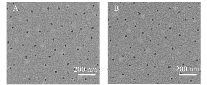 选用半导体聚合物PFO,采用纳米沉淀法合成PFO Pdots。如图 1A所示,所合成的半导体聚合物量子点呈球状均匀分布。在制备过程中,尽管半导体聚合物能均匀地溶解在THF里使其呈线状,但由于半导体聚合物本身固有的疏水特性使得聚合物表面仍然有大量疏水位点,因而在注水时能迅速卷曲成球形[17]。PEI是具有高阳离子密度的聚合物,在水中以聚合阳离子形式存在[18]。而半导体聚合物本身具有大量的共轭双键,其在聚合过程中部分双键会断裂形成表面带氧负离子的PFO Pdots,从而与带正电荷PEI通过静电作用组装成纳米复合物Pdots@PEI (图 1B)。浓度较低的Pdots在水中能均匀分散,因而PEI可均匀地与PFO Pdots结合形成球形带正电的Pdots@PEI(图 1B)。由图 1所示的透射电镜(TEM)可知,所制备的Pdots (图 1A)与Pdots@PEI (图 1B)都呈球状且均匀分散在水中,且两者粒径相近,约为25 nm,与文献[11]报道结果相一致。