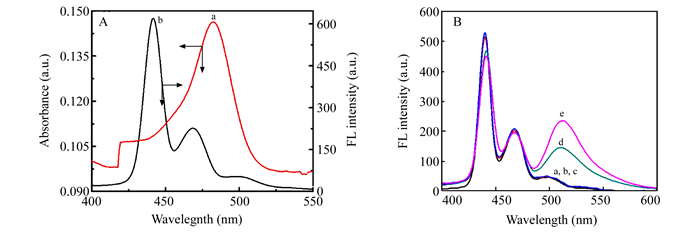 图 3 (A) 荧光素的吸收光谱(a)和Pdots@PEI的荧光发射光谱(b)。(B)不同体系的荧光光谱图:(a) PFO Pdots,(b)Pdots@PEI,(c)PFO Pdots + FDA(5 μmol/L) + CaE (50 U/L),(d)Pdots@PEI + FDA(5 μmol/L) + CaE (20 U/L),(e) Pdots@PEI+ FDA (5 μmol/L) + CaE (50 U/L)。激发波长为380 nm