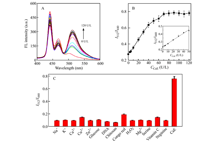 在最佳条件下,在检测体系(PFO Pdots@PEI 2.5 μg/mL, FDA 5 μmol/L)中加入不同浓度的CaE (0~120 U/L),于20 mmol/L HEPES (pH 7.4)中,37℃孵育60 min (以下实验条件均相同),结果如图 5A所示。随着CaE浓度增大,Pdots在440和467 nm处的荧光强度逐渐减弱,而FDA在512 nm处的荧光强度逐渐增强。如图 5B所示,当CaE的浓度达到70 U/L时,I512/I440达到稳定值。CaE的浓度在0.75~50.00 U/L时与I512/I440呈良好的线性关系(图 5B插图),线性方程为I512/I440 =0.2752+0.0087CCaE (R2= 0.9971),检出限为0.75 U/L(S/N=3)。为了验证本方法对CaE检测的选择性,选择了一系列常见干扰物质进行实验。如图 5C所示,与CaE的响应相比,Na+、K+、Ca2+、Cu2+、Zn2+、Mg2+、DNA、葡萄糖、壳聚糖、刚果红、H2O2、丝氨酸、vitamin C和精氨酸对本探针的响应较小,说明本方法对CaE的检测具有优良的选择性。
