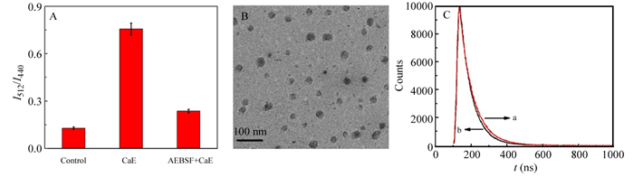 为了验证本分析体系中CaE对FDA的催化水解作用,加入CaE的抑制剂(AEBSF 2 mmol/L)进行对照实验,结果如图 6A所示。相比于CaE (80 U/L)组,空白组和加AEBSF组对探针的响应大幅度减弱,证明了本体系中CaE对FDA的催化水解作用。在反应后,Pdots@PEI与FDA的水解产物荧光素距离被拉近而结合生成复合物,反应后的产物的TEM图如图 6B所示,与图 1相比,其尺寸明显增大,粒径约为30 nm。为了近一步证明FRET的机理,测定了体系反应前后的荧光寿命,时间分辨光谱图如图 6C的所示,反应前后的荧光寿命分辨为3.72 ns和3.40 ns。由图 3B曲线c可见,未修饰PEI的PFO Pdots带有负电荷,其发射光谱不受荧光素影响,以上结果排除了内滤效应的影响,进一步证明了FRET的机理。