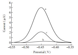 图 2 检测每毫升50000个细胞的HeLa细胞裂解液中的端粒酶的DPV图谱。(a)HeLa细胞裂解液+发卡环探针H1和H2; (b)发卡环探针H1和H2; (c) HeLa细胞裂解液+发卡环探针H1