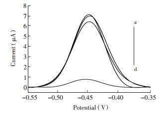 电化学检测实验在CHI660C电化学工作站上进行,采用三电极系统:金电极为工作电极,饱和甘汞电极(SCE)为参比电极,铂电极为对电极。使用差分脉冲伏安法(DPV)采集电化学信号,扫描范围为-0.55~-0.35 V。在电化学测试前,溶液中通入氮气15 min。