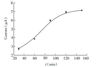 对HCR反应时间进行了优化。如图 4所示,随着HCR过程持续时间的逐渐延长,检测相同浓度端粒酶时得到的DPV响应峰电流值逐渐增加; 当反应时间超过120 min后,DPV响应峰电流值基本保持恒定。因此,最终选择120 min作为HCR过程的反应时间。