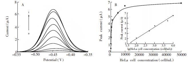 图 5 (A) 检测不同浓度HeLa细胞裂解液中的端粒酶时所得到的DPV图谱。从a至i分别为0、10、50、100、500、1000、5000、10000和50000 HeLa cell/mL。(B)DPV响应峰电流值与HeLa细胞浓度之间的关系。插入图为HeLa细胞浓度在10~10000 cell/mL范围内,峰电流值与浓度对数值之间的线性关系