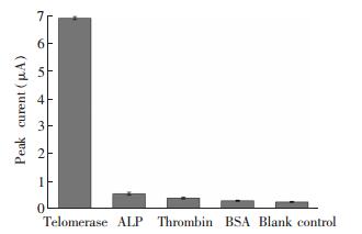 Reference电化学 Electrochemical method 1000~6000 1000 [7] 电化学发光 Electrochemiluminescence 50~1000000 11 [8] 比色 Colorimetry 0~200 29 [9] 电化学 Electrochemical method 500~10000000 100 [11] 电化学 Electrochemical method 50~10000 10 本方法 This method 考察了所建立的方法应用于端粒酶检测时的选择性。实验结果如图 6所示,同样的条件下,检测浓度为每毫升50000个细胞的HeLa细胞裂解液中端粒酶时得到的DPV响应峰电流值约为7 μA; 而对于非特异性蛋白,最终得到的DPV响应峰电流值仅略高于空白对照组的响应值。这表明本方法用于检测端粒酶具有良好的选择性。