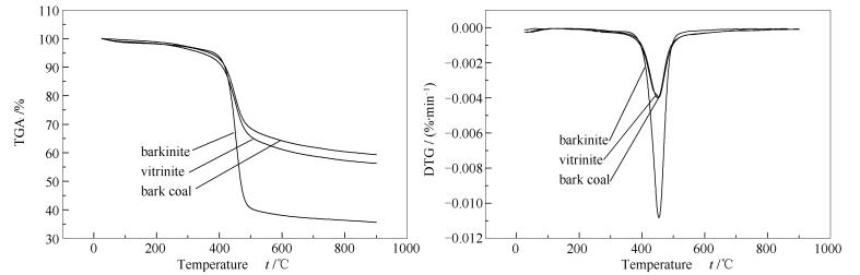 φ/%Mad Ad Vdaf C H O* N St,d V Ba OL+I Bark coal 0.67 1.02 8.15 52.80 73.27 5.64 10.54 1.42 0.98 0.92 24 68 8 Barkinite - 0.84 0.39 69.93 - - - - 1.01 - 3 96 1 Vitrinite - 1.20 6.09 45.74 81.45 5.24 10.73 1.26 1.31 0.77 87 12 1 note: Ro: the mean maximum vitrinite reflectance; M: moisture; A: ash; V: volatile matter; ad: air-dry basis; d: dry basis; daf: dry-ash-free; V: vitrinite; Ba: barkinite; I: inertinite; OL: other liptinites; *: by difference; -: no determined 2.2 树皮体的热重性质