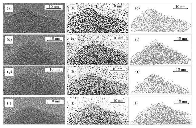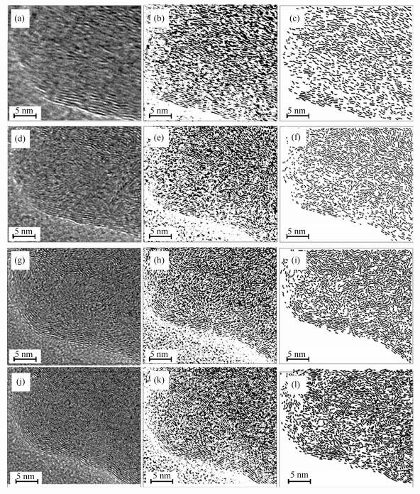 由于树皮体和镜质组的失重剧烈区间主要集中在370-550 ℃,且在450 ℃左右达到最大。因此,选择350-500 ℃研究树皮体和镜质体受热过程中化学结构特征的变化。依据Sharam等[19]的处理办法,对样品的TEM照片进行了分析和处理。根据Van Niekerk等[24]提出的晶格条纹归属分类(表 3)。对TEM照片中的晶格条纹的长度进行了统计,处理后的树皮体和镜质体图像分别如图 2和图 3,得到的晶格条纹的长度分布特征如图 4。