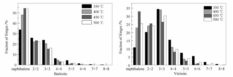 从图 4进一步研究得到,在同一温度下,树皮体和镜质体含有的芳香条纹种类相似,其含量以萘、2×2和3×3条纹为主,其次是4×4和5×5条纹,其他的条纹含量均较低。相比较而言,树皮体含有的萘含量高于镜质体,而两者的2×2条纹含量相近。但镜质体中的3×3条纹、4×4和5×5条纹的含量高于树皮体,这表明镜质体比树皮体的化学结构更加芳构化。