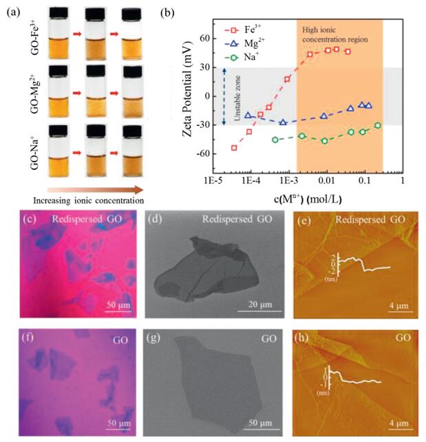 Figure 1 (a) Digital images of the GO-Mn+ dispersions with the increasing ionic concentration. (b) Zeta (ζ) potential of the GO-Mn+ as a function of the concentration of Na+, Mg2+ and Fe3+, respectively. Optical microscope images of the redispersed GO in GO-Fe3+ system (c) and GO in pure water (f). SEM images of the redispersed GO in GO-Fe3+system (d) and GO in pure water (g). AFM images of the redispersed GO in GO-Fe3+ system (e) and GO in pure water (h).