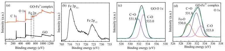 For the GO-Fe3+ system, the redispersion process is accompanied by surface adsorption. Metal cations are reported to be bound to the surface through electrostatic attraction with carboxylic groups on GO sheets [25]. However, there is still confusion whether any other interactions were involved. We prepared GO-Fe3+ complex to analyze the interaction between GO and Fe3+. XPS spectra revealed that the adsorption of Fe3+ onto GO depends not only mainly on electrostatic attraction but also highly on complexation with oxygen-containing groups. The spectra (Fig. 3a) of neat GO, GO-Fe3+ complex show a predominant graphitic C 1s peak at 285.0 eV and an O 1s peak at 532.0 eV [36, 37]. By contrast, the characteristic Fe 2p peak is clearly observed at 711.0 eV in GO-Fe3+ complex [36, 37]. The Fe content of GO-Fe3+ complex is 6.26%, demonstrating that there is a large portion of Fe3+ ions tightly loaded on the GO after repeated washing. Fig. 3b shows a pair of peaks at 710.8 eV and 724.2 eV that are assigned to Fe 2p3/2 and Fe 2p1/2 [36, 37], respectively, indicating the formation of Fe-O coordination according to the Binding Energy Contrast Table. The O1s spectra of GO and GO-Fe3+ complex were depicted in Figs. 3c and d. For GO sample, the O1s spectra (Fig. 3e) is deconvoluted into two peaks at 531.8 eV and 533.0 eV, which can be attributed to oxygen containing functional groups, that are, C=O and C-O, respectively [38]. For GO–Fe3+ complex sample, a new peak at 530.0 eV in Fig. 3d is assigned to the Fe-O [38], in correspondence to the formation of Fe-O complexation. The C 1s spectra of GO and GO-Fe3+ complex were illustrated in Fig. S4 (Supporting information). The content of C=O and O=C-O-H decreased severely after GO reacting with Fe3+, demonstrating that the Fe3+ is coordinated with C=O and O=C-O-H on GO sheets.