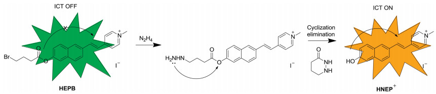 In view of these above factors, we used merocyanine derivative (HNEP+) as the fluorophore and 4-bromobutyric acid as the reaction site [15] and constructed a novel probe NEPB for hydrazine. As shown in Scheme 1, intramolecular charge transfer (ICT) process played important part in the construction of ratiometric probes. Here, 4-bromobutyric acid also acted as an electron-withdrawing group and blocked the ICT process of the fluorophore. When probe NEPB reacted with N2H4, a substitutioncyclisation-elimination reaction happened at the recognizing site and released fluorophore HNEP+, which exhibited the ICT properties with large Stokes shifts and long emission wavelength. Probe NEPB was easily prepared within three steps as shown in Scheme S1 (Supporting information) and characterized by standard 1H NMR, 13C NMR and HRMS spectra (Supporting information).