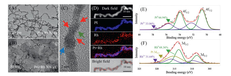 Figure 1. TEM of (A) Pt@Rh NWs and (B) Pt@Rh NWs/C; (C) HRTEM image of Pt NWs highlighted the presence of rich defect sites with arrows; (D) elemental mapping of Pt@Rh NWs using HAADF-STEM-EDS pattern; XPS spectra of Pt 4f (E) and Rh 3d (F).To direct locating the Rh atoms, the Pt@Rh NWs were further observed by CS-HAADF-STEM. However, for the lower Z of Rh over that of Pt, we could not distinguish Rh atoms from Pt atoms based on their difference in Z contrast in HAADF-STEM image. Therefore, we manage to study the distribution of Rh atoms on Pt@Rh NWs by EDS mapping (Fig. 1D and Fig. S4 in Supporting information). By combining the EDS mapping and the bright-field image, where the defect sites were marked with red lines, it can conclude that Rh atoms is primarily deposited on the defective sites of the catalyst. Meanwhile, X-ray photoelectron spectroscopy (XPS) analysis revealed that the presence of Rh adatoms had neglectable influence on the electronic structure of Pt atoms, as neither the Pt 4f or Rh 3d spectrums of the Pt@Rh NWs changed upon the formation of core-shell structured NWs (Figs. 1E and F and Fig. S5 in Supporting information). Moreover, detailed curve fitting revealed that 70% of the Pt and Rh existed as Pt0 and Rh0 in the Pt@Rh NWs, which was in the same order with their monometallic counterparts. Therefore, the developed Pt@Rh is an ideal paradigm in studying the role of defective sites in the electronic process.