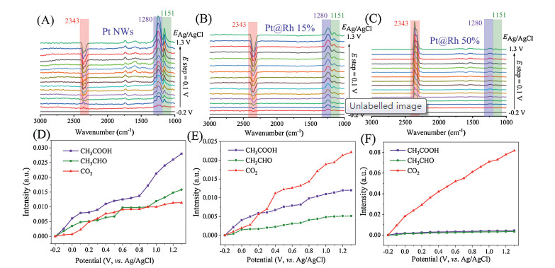 To gain a deeply understanding of the electrooxidation process, electrochemical in situ FTIR studies were performed on these Pt@Rh catalysts (Fig. 3 and Fig. S7 in Supporting information). Various absorption bands appear in the spectrum as the electrode potential increases. According to previous studies [6, 27], the band at 2343 cm-1 assigned to the asymmetric tensile vibration of CO2 is associated with complete oxidation of the alcohols [22]. The IR band at 1151 cm-1 is indicative of forming formaldehyde and acetaldehyde, and the other band at 1280 cm-1 belongs to the C—O tensile deformation indicating to the formation of carboxylic acid [28] (Table S1 in Supporting information). The right side of the figure shows the in situ infrared spectrum intensity statistics of different products. For the EOR on the Pt NWs catalyst (Figs. 3A and D), only a small amount of CO2 is produced, and majority of the products are acetaldehyde and acetic acid. When the amount of Rh increased to 15% (Figs. 3B and E), CO2 became the major products, and with the further increase of Rh amount to 50% (Figs. 3C and F), almost no acetaldehyde and acetic acid were formed in the reaction, and nearly all of the ethanol molecules were completely oxidized to CO2. Therefore, the selectivity of the Pt@Rh catalyst for CO2 and CH3COOH is very sensitive to the mount of Rh atoms. As the number of external Rh atoms increased, the selectivity toward CO2 gradually increased, and Pt@Rh 50% exhibited the highest CO2 selectivity. The surface of the Pt NWs catalyst contains abundant defect sites, and these sites possess excellent electrocatalytic activity. However, the Rh atoms take up the defect site and reduces the adsorption of the intermediate on the defects, which is a key factor for decreasing the poisoning effect. This result is consistent with the results obtained from the CO-stripping experiment and cyclic voltammetry (CV) curve, indicating that the Rh atom is beneficial for improving the complete oxidation ability of the catalyst. Therefore, the defect site on the Pt NWs is very active in the electrooxidation process of alcohol fuel, but also suspicious for poisoning. The Rh atom blocking strategy effectively regulates the defect richness, inhibits the formation of poisoning intermediates and promotes the complete oxidation of the alcohol fuel.