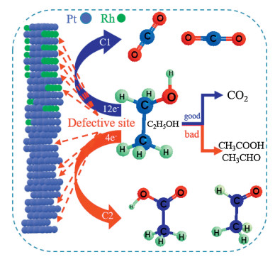 In summary, we demonstrated the successful preparation of defect-regulated Pt@Rh NWs, which use as effective oxidation electrocatalysts for alcohol fuel. It was verified that the defect sites were both acting as the reactive site and the main point of poisoning. By loading different amounts of Rh atoms onto the defect sites, the oxidation potential was effectively reduced, the accumulating of poison intermediates was also suppressed. What is more, the Rh atom effectively altered the structure of the defect site and improved the ability of the catalyst to electrooxidize the alcohol fuel. The catalyst not only completely oxidizes methanol but also promotes C—C bond cleavage of ethanol, resulting in their complete oxidation. Therefore, the defect blocking strategy significantly improved the activity of the catalyst as well as the product selectivity. In addition, the reaction process converts from the C2 path to the C1 path. This change allows the energy from the oxidation of the alcohol fuel to be completely converted. This work provides a new basis for the design and synthesis of novel catalysts for alcohol fuel oxidation.