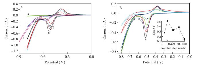 图 2 (A) 电化学还原和电化学聚合时间比对葡萄糖催化氧化的影响:电化学还原与电化学聚合时间比分别为a: 1:0、b: 0.6:0.4、c: 0.7:0.3、d: 0:1、e:0.3:0.7、f: 0.4:0.6、g: 0.5:0.5 s,阶跃次数设置为100; (B)阶跃次数对葡萄糖催化氧化的影响,内插图为阶跃次数与葡萄糖催化氧化峰电流的关系