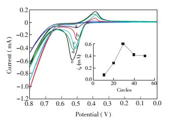 在上述最佳条件下,将PEDOT-rGO/GCE电极浸入除氧的0.02 mol/L NiSO4溶液中,采用循环伏安法电化学沉积NiNPs,设置电位扫描范围为-0.9~0.6 V,循环圈数分别为10、20、30、40和50。由图 3可见,当循环圈数为30时,葡萄糖的催化氧化峰电流最大,催化效果最好。沉积时间短,可能导致NiNPs在电极表面的沉积量少,对葡萄糖的催化效果不佳; 沉积时间过长,可能会改变纳米颗粒的尺寸,甚至发生聚合,从而影响葡萄糖的催化氧化效果。因而,选择循环扫描圈数为30圈。