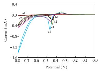 不同修饰电极对葡萄糖催化氧化的循环伏安曲线见图 4。由曲线a1和a2可知,PEDOT-rGO/GCE对葡萄糖的催化效果并不明显,而修饰电极Ni NPs/GCE在氢氧化钠溶液中有一对氧化还原峰(b1),氧化还原峰的产生是由于Ni(OH)2和NiOOH之间的转化所致,氧化峰电位约为0.46 V,还原峰电位约为0.38 V。加入葡萄糖后(b2),氧化峰位置正移至0.48 V左右,峰电流有所增加,还原峰几乎无变化,这是由于NiNPs与溶液中的OH-发生了反应,其生成物对葡萄糖的氧化有良好的催化作用。其反应过程大致如下[47~49]: