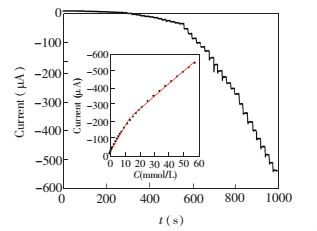 图 6 在0.1 mol/L NaOH溶液中连续加入适量葡萄糖所测得i-t曲线(内插图为葡萄糖的氧化电流与其浓度的关系曲线,工作电位为0.5 V)