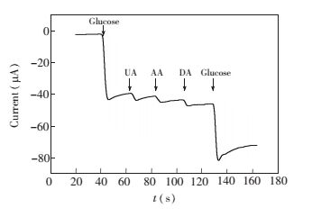 为了检验此传感器NiNPs/PEDOT-rGO/GCE对葡萄糖检测时的选择性和抗干扰能力,考察了尿酸(UA)、抗坏血酸(AA)、多巴胺(DA)对葡萄糖检测的干扰。在0.01 mol/L的UA、AA、DA存在时,1.0 mmol/L葡萄糖在本传感器上的响应变化情况见图 7。从i-t曲线可见,分别加入10倍的UA、AA、DA尿时,传感的电流响应变化很小,对葡萄糖的测定干扰可以忽略不计,表明此传感器具有较强的抗干扰能力。
