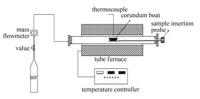将样品烘干后研磨至粒径小于200目[10],称取(2.00±0.01) g,置于高温管式炉反应区进行实验研究。实验系统示意图见图 1,空气流量为4 L/min,燃烧温度为1000、1100、1200、1300、1400 ℃,停留时间为5-60 min。石油焦样品和燃烧残渣在马弗炉中灰化处理,灰化温度700 ℃[7],之后将灰样消解,用ICP-OES测定钒含量。