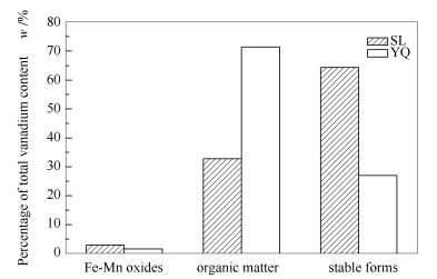 为确定石油焦中钒的赋存形态,用逐级化学提取的方法对SL和YQ石油焦进行分析。两种石油焦中钒的赋存形态及其含量分布见图 2。由图 2可知, 石油焦中钒的赋存形态包括氧化物结合态、有机质结合态和稳定态,其中, 氧化物结合态的钒在两种石油焦中所占比例都在1%-3%,但有机质结合的钒和稳定态钒所占比例差别比较大,这可能与石油生成的地质条件及其伴生的矿物成分有关。对于SL石油焦,与有机质结合的钒和稳定态钒质量分数分别为33.7%和63.55%;而YQ石油焦,与有机质结合的钒和稳定态钒质量分数则分别为71.35%和27.06%。可见,与文献报道结果不同,石油焦中钒的赋存形态以有机结合态和稳定态两种形式为主。石油焦中钒的有机结合态与Kelemen等[5]和Amorim等[6]发现石油焦中的钒主要以钒卟啉的有机化合形式存在相一致。至于石油焦中稳定态的钒,则需结合XRD进一步进行探讨。